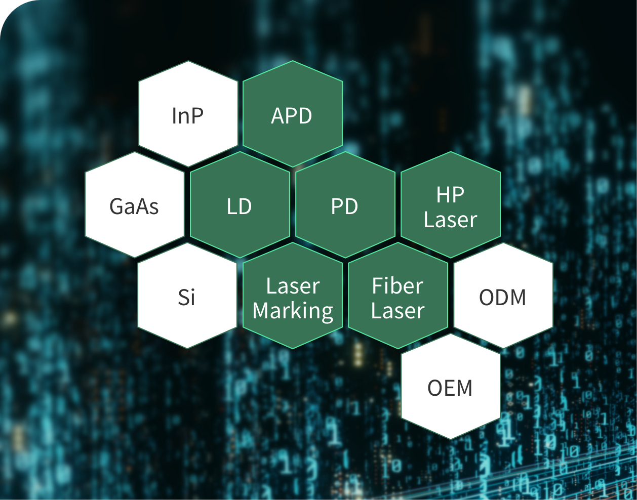 我們提供雷射相關應用產品、晶片週邊資源技術服務,以及晶片OEM與ODM的服務,晶片內容主要包含收發光元件與被動元件。除了晶片產品,我們也提供從磊晶到封裝、從原料到製程、從廠商到客端的科技諮詢。